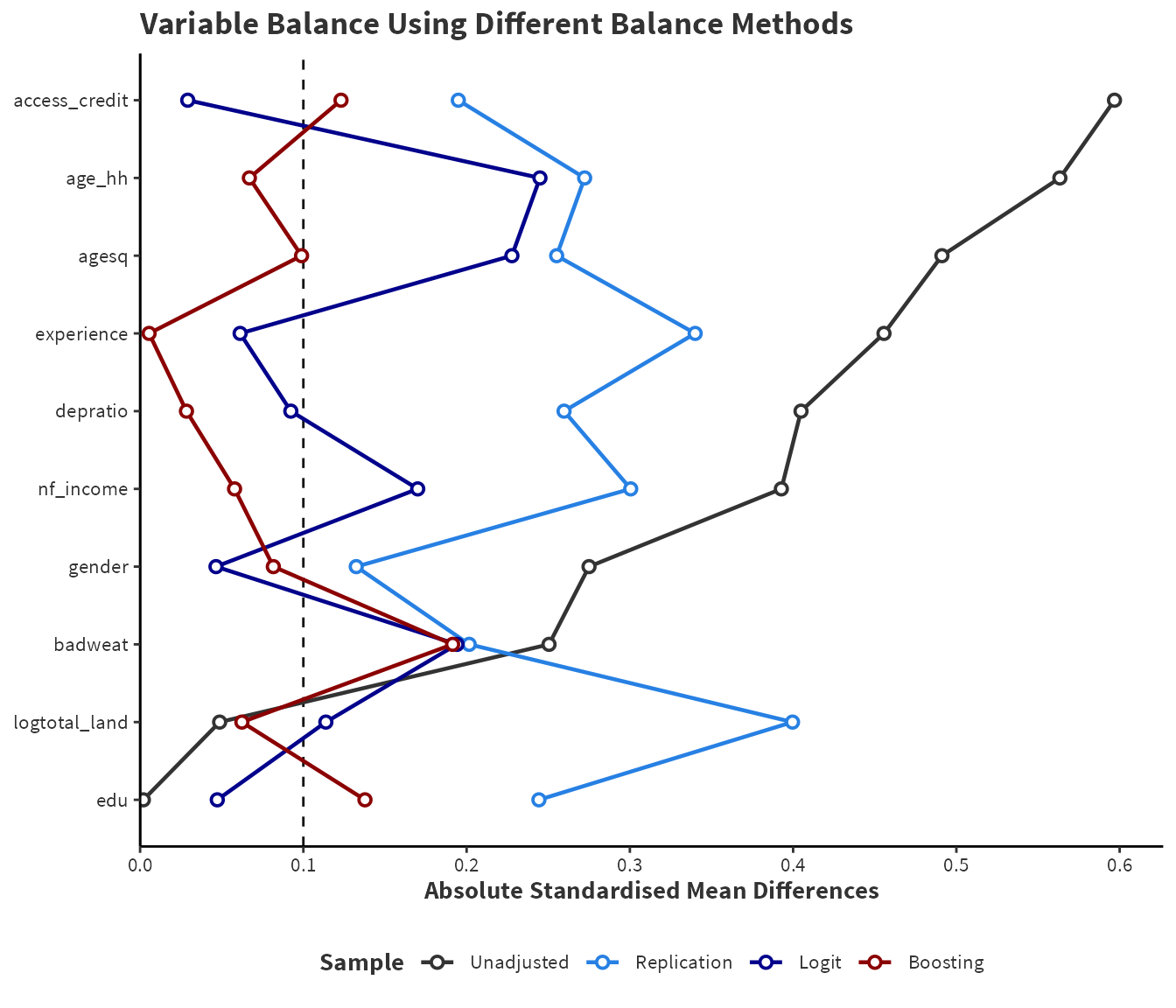 Logistic regression has a satisfactory average SMD of \(0.077\). Boosting has an average SMD of \(0.0498\) which is excellent and narrowly meets a rigorous threshold of \(0.05\).
