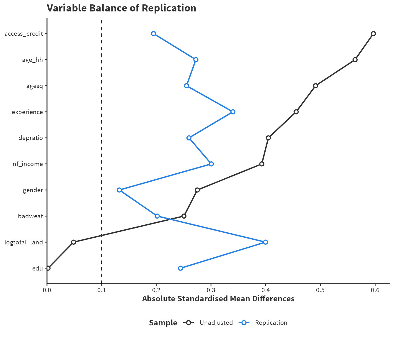 Four key variables: age, gender, education, and access to credit all exhibit poor balance. These variables are strong confounders in theory and so emphasising balance in these variables is critical to making a robust causal inference. Perhaps there is gender or age discrimination in the certification process. Perhaps, those with lesser education may struggle to obtain certification. Perhaps those who have less access to credit are unable to afford to become certified. Moving forward, these variables must exhibit better covariate balance to make a robust conclusion.