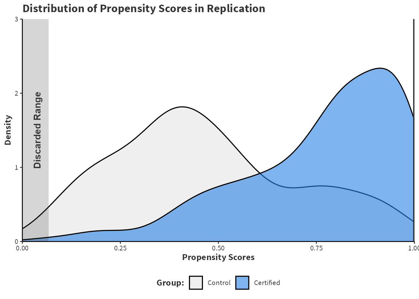# Create Figure 4.2discarded_scores <- coffee_rep_pmodel$distance[coffee_rep_pmodel$discarded]discard_min <-min(discarded_scores, na.rm =TRUE)discard_max <-max(discarded_scores, na.rm =TRUE)ggplot(coffee_data, aes(x = coffee_rep_pmodel$distance, fill =factor(certified))) +geom_density(alpha =0.6, linewidth =0.6) +scale_fill_manual(values =c("#e5e5e5", "#2780e3"), labels =c("Control", "Certified")) +labs(title ="Distribution of Propensity Scores in Replication", x ="Propensity Scores", y ="Density", fill ="Group:") +scale_x_continuous(expand =expansion(0), limits =c(0, 1)) +scale_y_continuous(expand =expansion(0), limits =c(0, 3)) +geom_vline(xintercept = discard_max, color ="#333333", linewidth =0.8) +annotate("rect", xmin =0, xmax = discard_min, ymin =-Inf, ymax =Inf, fill ="#333333", alpha =0.2) +annotate("rect", xmin = discard_max, xmax =1, ymin =-Inf, ymax =Inf, fill ="#333333", alpha =0.2) +annotate("text", x =0.02, y =1.5, label ="Discarded Range", angle =90, vjust =1.5, size =4,fontface ="bold", color ="#333333") + custom_ggplot_theme